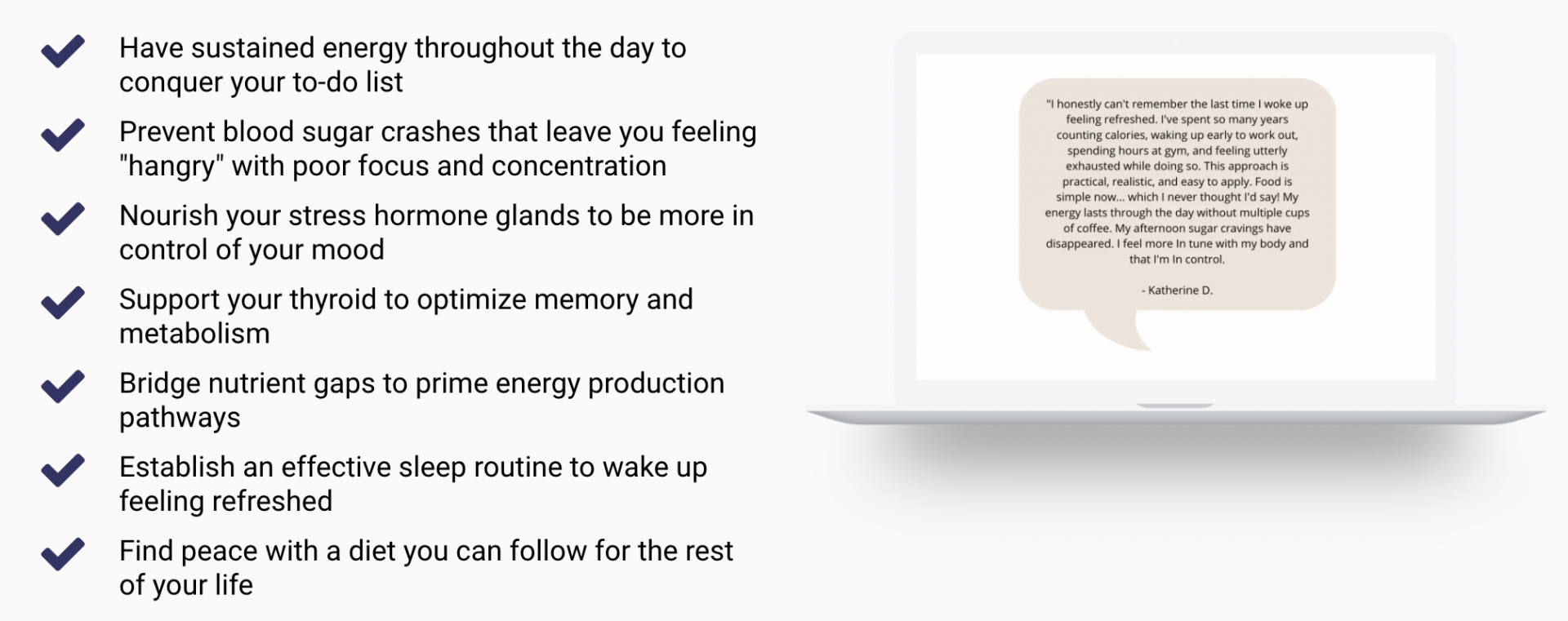 Easy to implement food-as-medicine tactics to overcome brain fog, enhance energy, optimize thyroid, boost metabolism and beat bloat through sustainable & realistic nutritional therapies